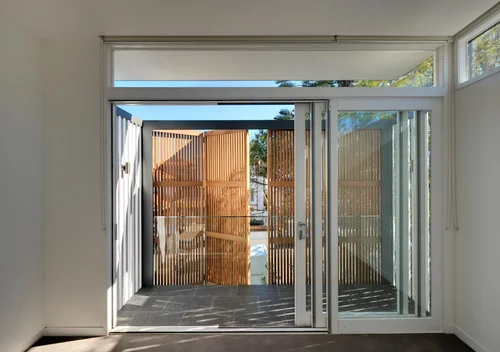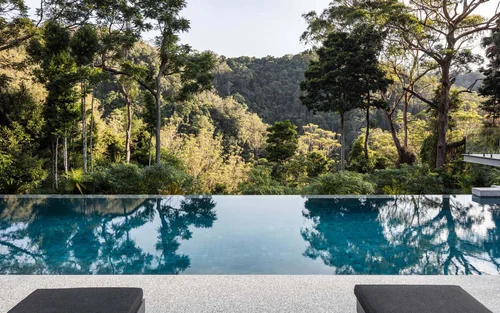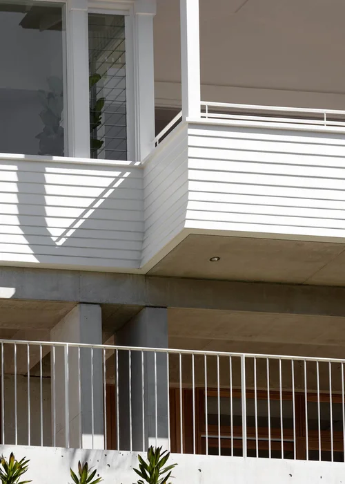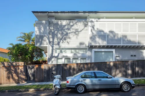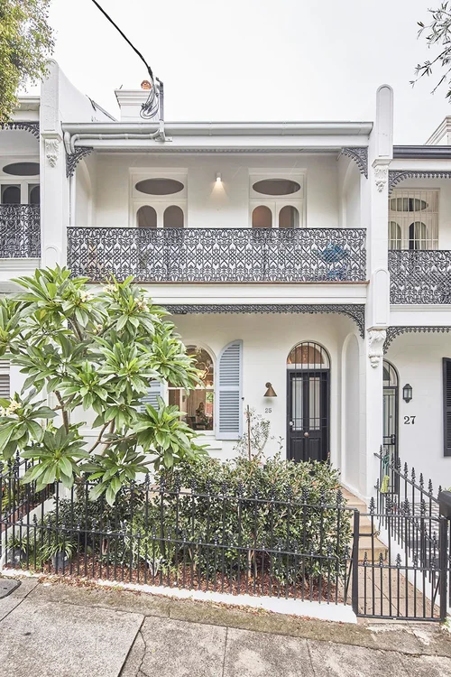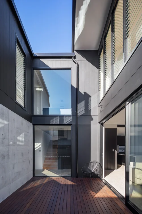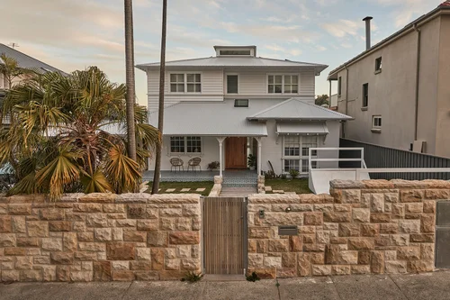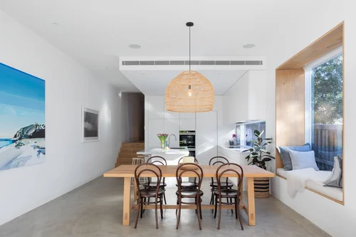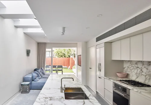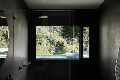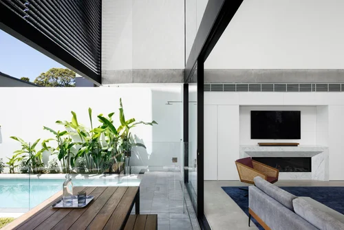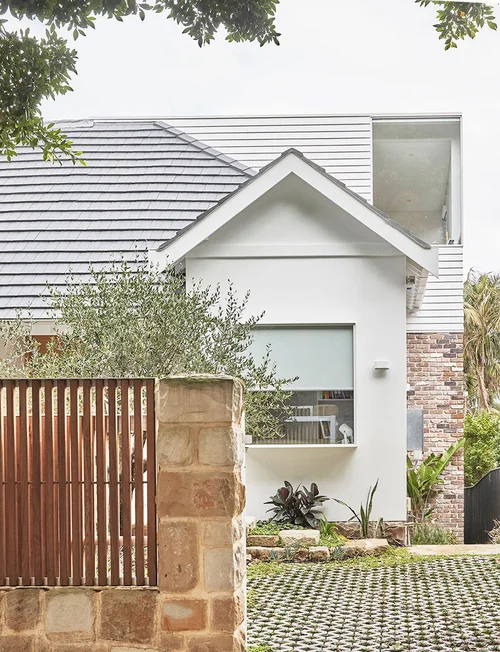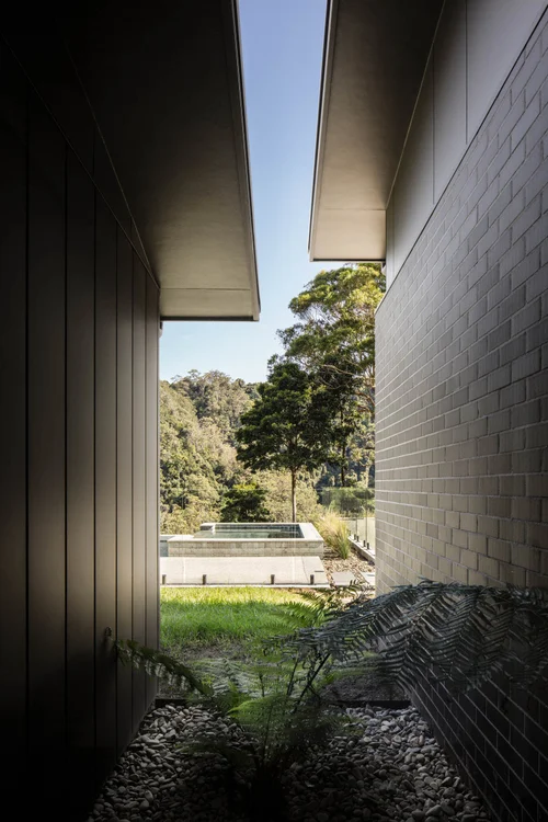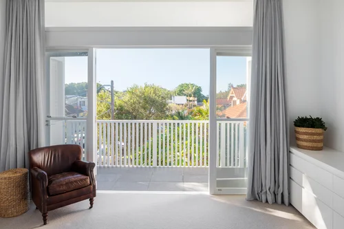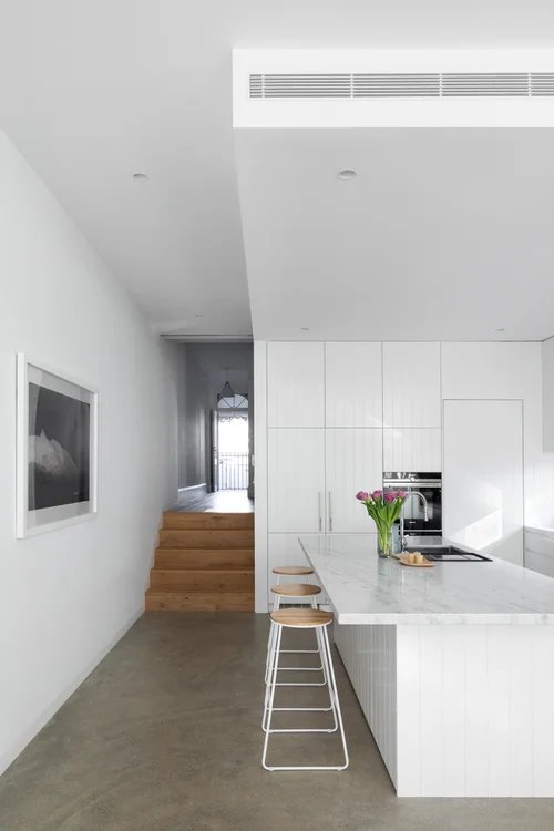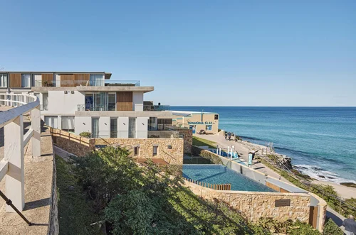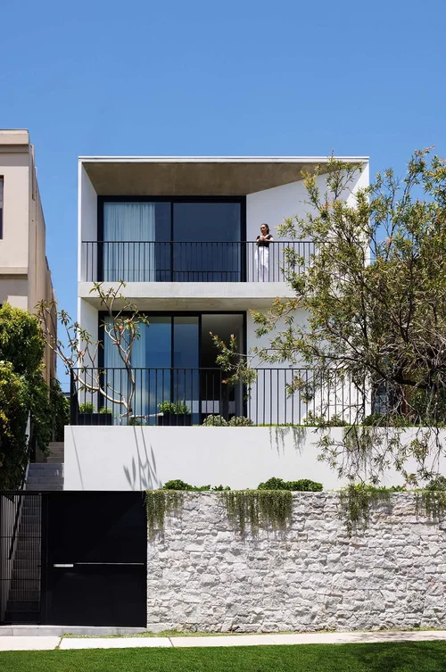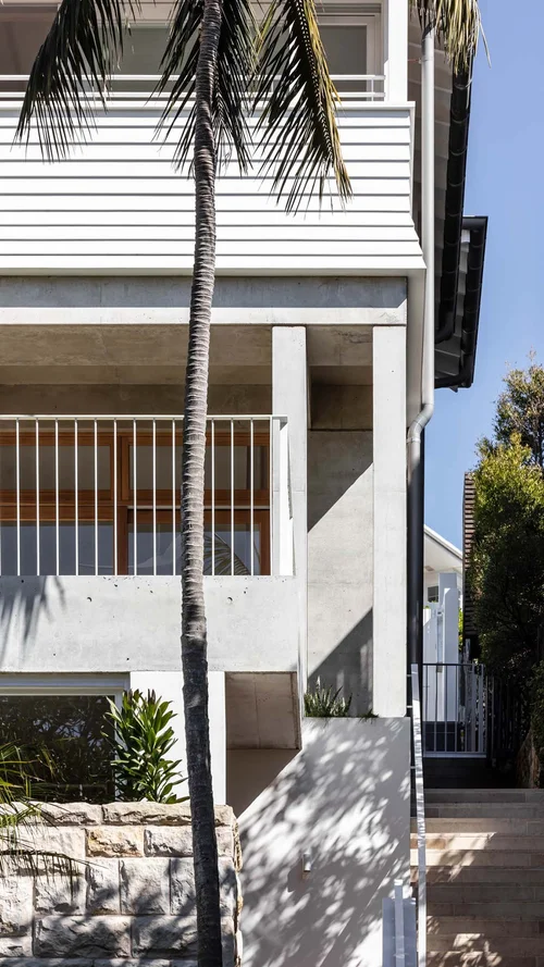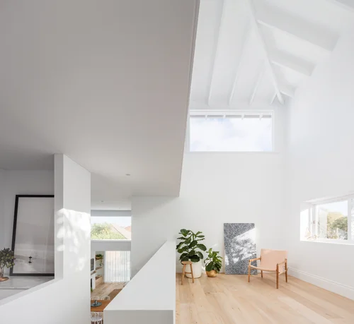 The ground floor houses the kitchen, main living, and dining area and connects to a swimming pool and courtyard at the rear while a balcony was added at the home’s frontage. Benefiting from the site's sloped topography, the elevated balcony provides broad views of nearby Bronte and its headlands to the north and south.