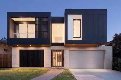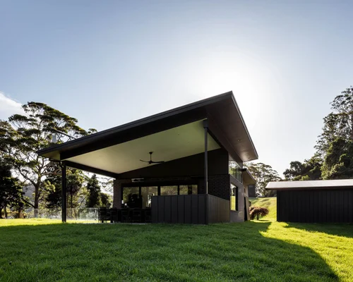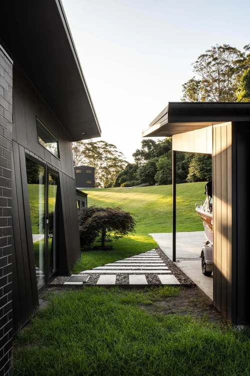 On the lower ground floor, a concrete colonnade with paired columns that echo the timber detailing of the renovated home above articulates the entry. The floor also features four kids' bedrooms all centred around a common living area.