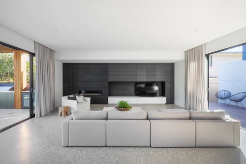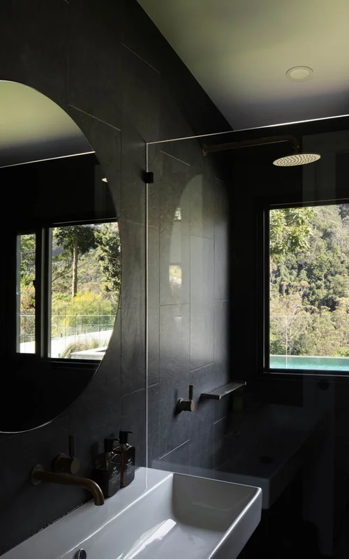 Bathroom designs feature arched forms and rounded edges, which are complemented by a micro cement finish on the floors, walls, and ceilings. These spaces are a sanctuary in a home that otherwise embraces its location overlooking one of Australia’s busiest and most beautiful beaches.
