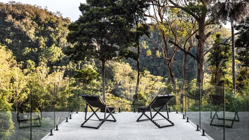 Concrete and stone materiality links the interior and exterior, while timber-framed glazing and wall cladding create a visual connection with the home’s landscaped embankment and the trees beyond.